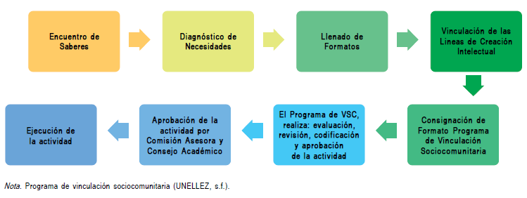 El Reglamento de Vinculación Sociocomunitaria de la UNELLEZ (2021, p. 5), en su artículo 1, establece: «La vinculación sociocomunitaria es el proceso de educación no formal y permanente entre la institución y la comunidad intra y extrauniversitaria, implica el desarrollo de diplomados, actividades especiales, proyectos».