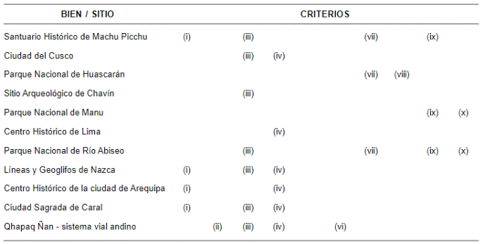 bienes y sitios peruanos inscritos en la lista del Patrimonio Mundial de la