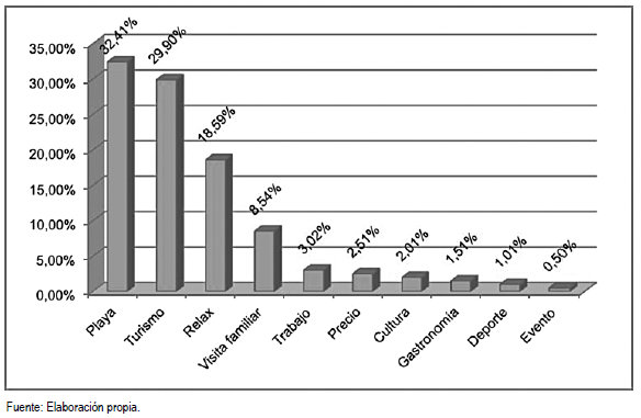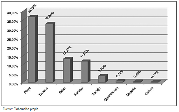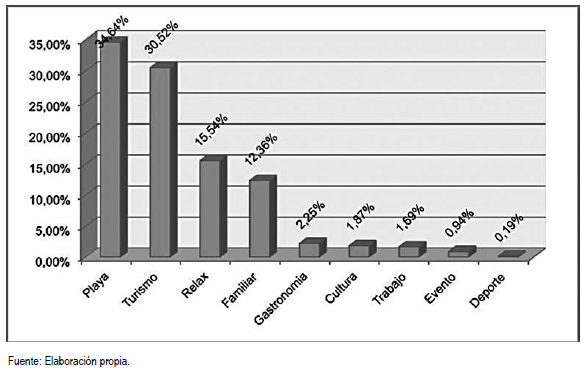 El motivo de la visita se indicó de la siguiente manera: playa 34.64% (185); turismo vacacional 30.52% (163); relax 15.54% (83); visita a familiar o de amistad 12.36% (66); astronomía 2.25% (12); cultural 1.87% (10); entre otros (Figura 5).