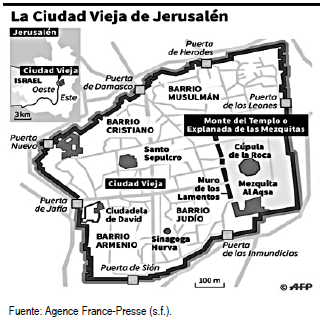 France-Presse. (s.f.). Mapa de la ciudad vieja de Jerusalén. Recuperado de https://www.scoopnest.com/es/user/AFPespanol/1022854622568837120-mapa-de-la-ciudad-vieja-de-jerusalen-localizando-la-explanada-de-las-mezquitas-cuyo-acceso-ha-sido-cerradotras-disputas-entre-palestinos-y-fuerzas-del-orden-israelies/