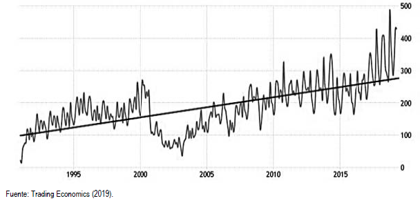 Figura 4. Proyección de las visitas a Israel (1990-2019).