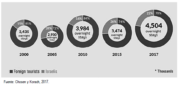 A continuación, se presenta los datos turísticos nacionales de Israel, así como de su capital Jerusalén, debido a que aproximadamente el 80% de los turistas extranjeros la visitan en algún momento de su viaje; para ello, se toma como referencia la información oficial del Ministerio de Turismo de Israel (como se citó en Korach & Choshen, 2018).