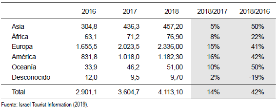 Como es de esperar, el origen de los visitantes extranjeros es variado, pero su número refleja una similar tendencia de crecimiento. La mayor cantidad de turistas procede del continente europeo; se convierte así en la principal fuente de visitantes al país, siendo más de la mitad de los extranjeros que recibe Israel. Además, la evolución de las visitas de los turistas europeos muestra un incremento al 41% desde 2016-2018 (Tabla 1).
