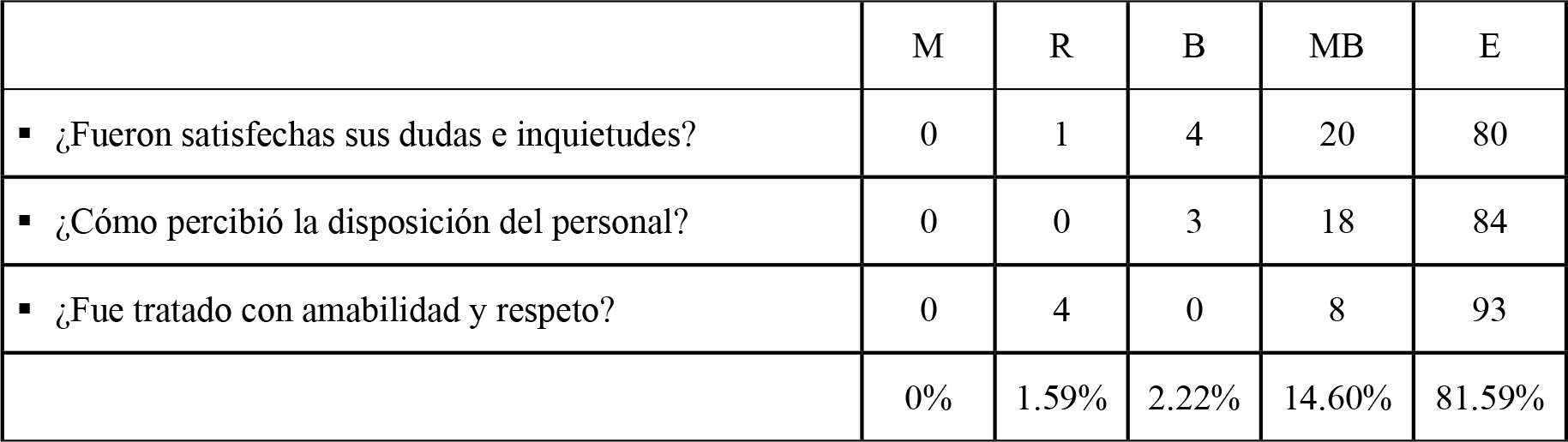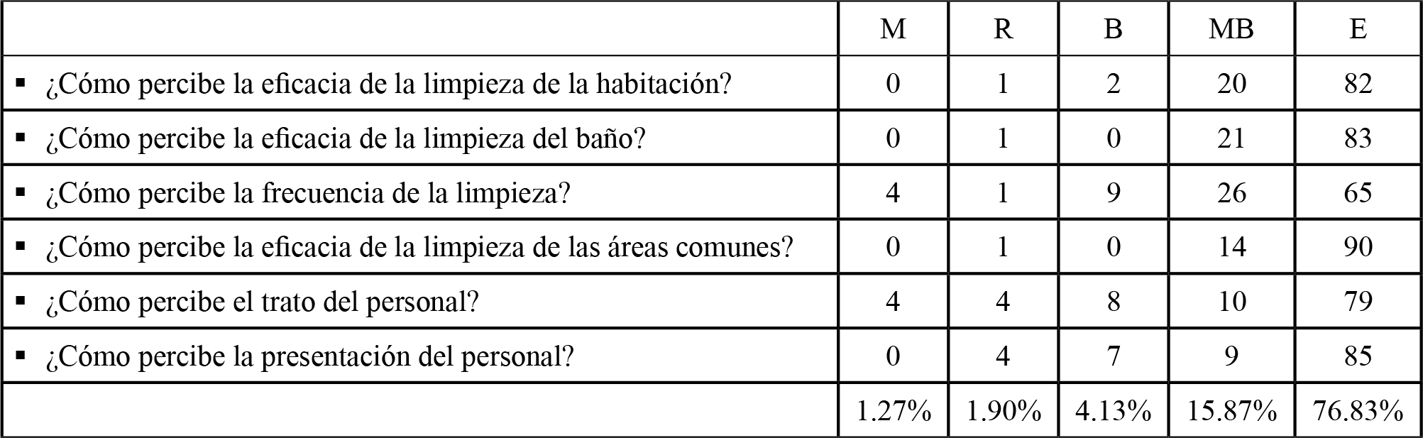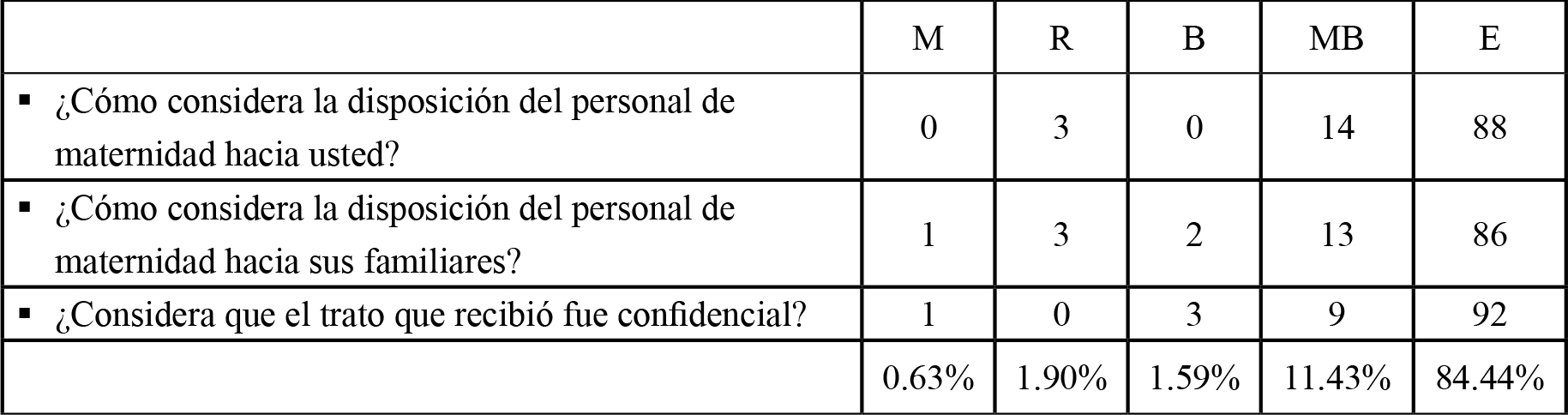 Mediante los resultados obtenidos, se concluye que la percepción de la calidad global de la hotelería hospitalaria en la maternidad del HSIH supera el 95% de satisfacción. Esto es, 78.87% que respondieron excelente