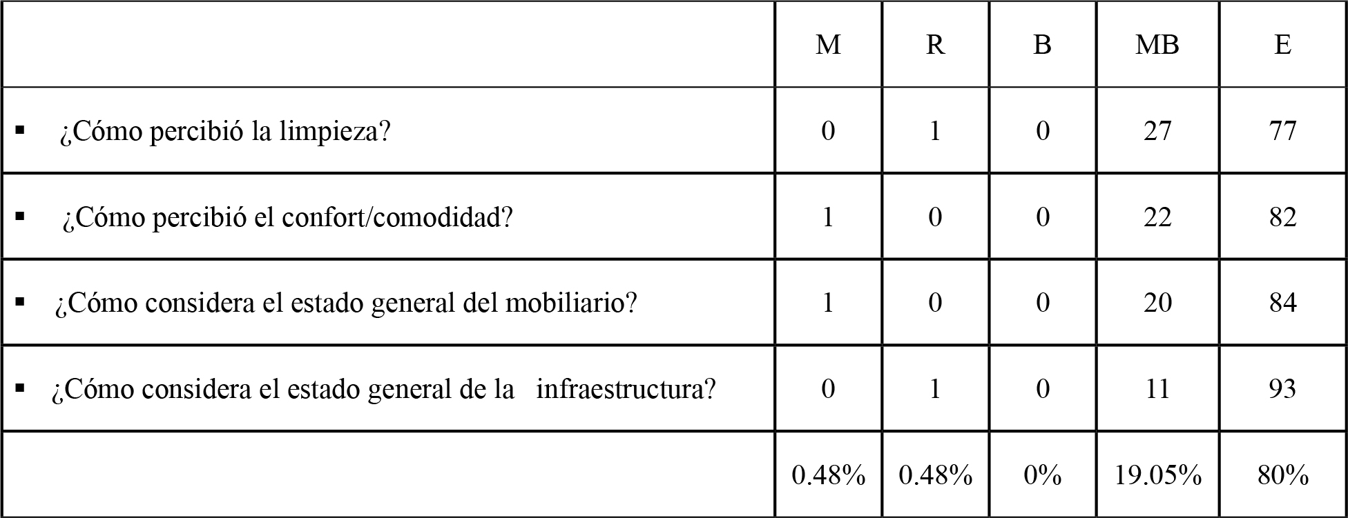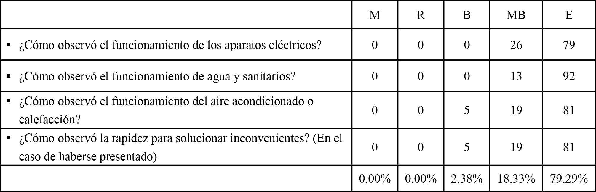 (83 usuarias) y 16.23% muy buena (17 usuarias). Los aspectos más destacados son comunicación, alojamiento, atención al cliente, seguridad y mantenimiento. En consecuencia los ajustes que se deben realizar son mínimos.