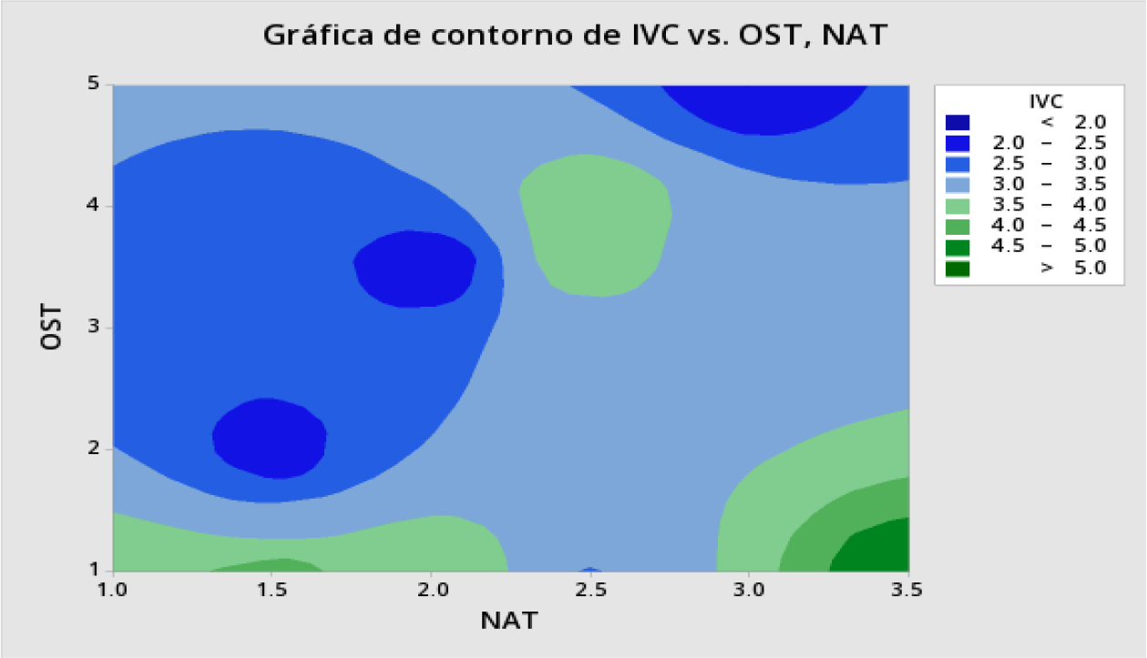 Finalmente, se utilizó la herramienta Gráficas de Contorno de Minitab 18 para mostrar la forma en que se relacionan los valores ajustados de las variables OST y NAT con el Índice de Vulnerabilidad Climática. En la Figura 3 se aprecian las bandas de contorno de color, que representan los valores de respuesta ajustada, el agrupamiento de los municipios en al menos tres diferentes tipos de territorio; asimismo, los contornos curvos denotan la presencia de términos cuadráticos estadísticamente significativos (Minitab, 2019).