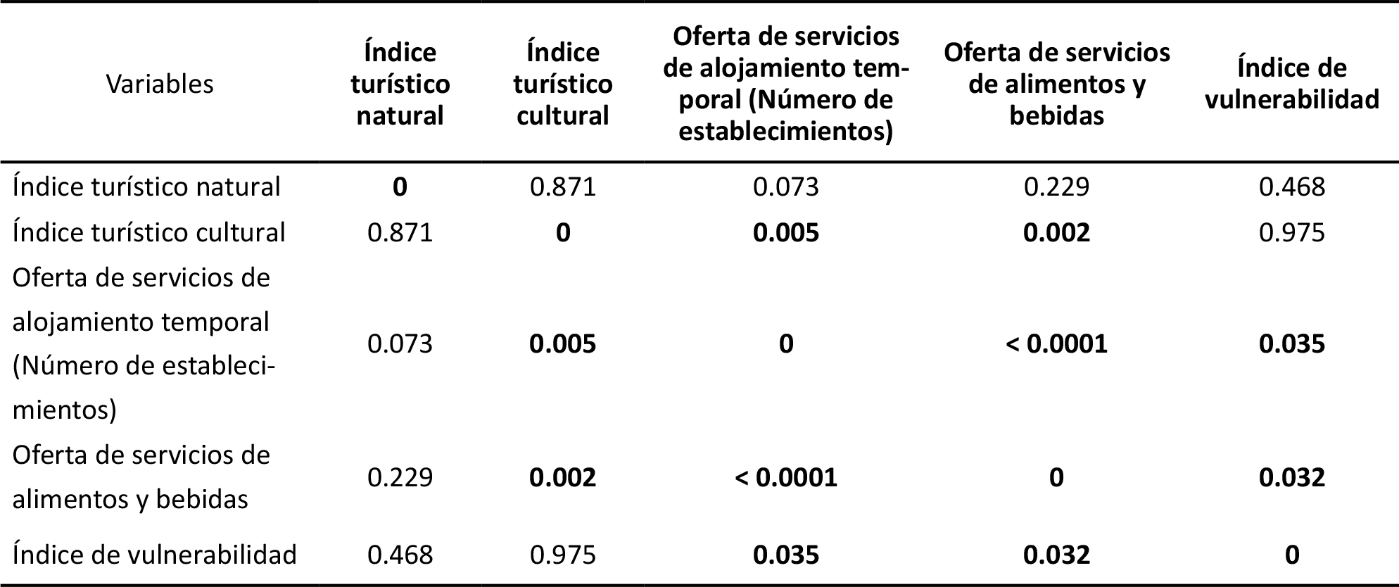 significativas entre la oferta de servicios turísticos y el índice turístico cultural; no ocurre lo mismo con el índice turístico natural y la oferta de servicios turísticos, donde la correlación no es significativa.