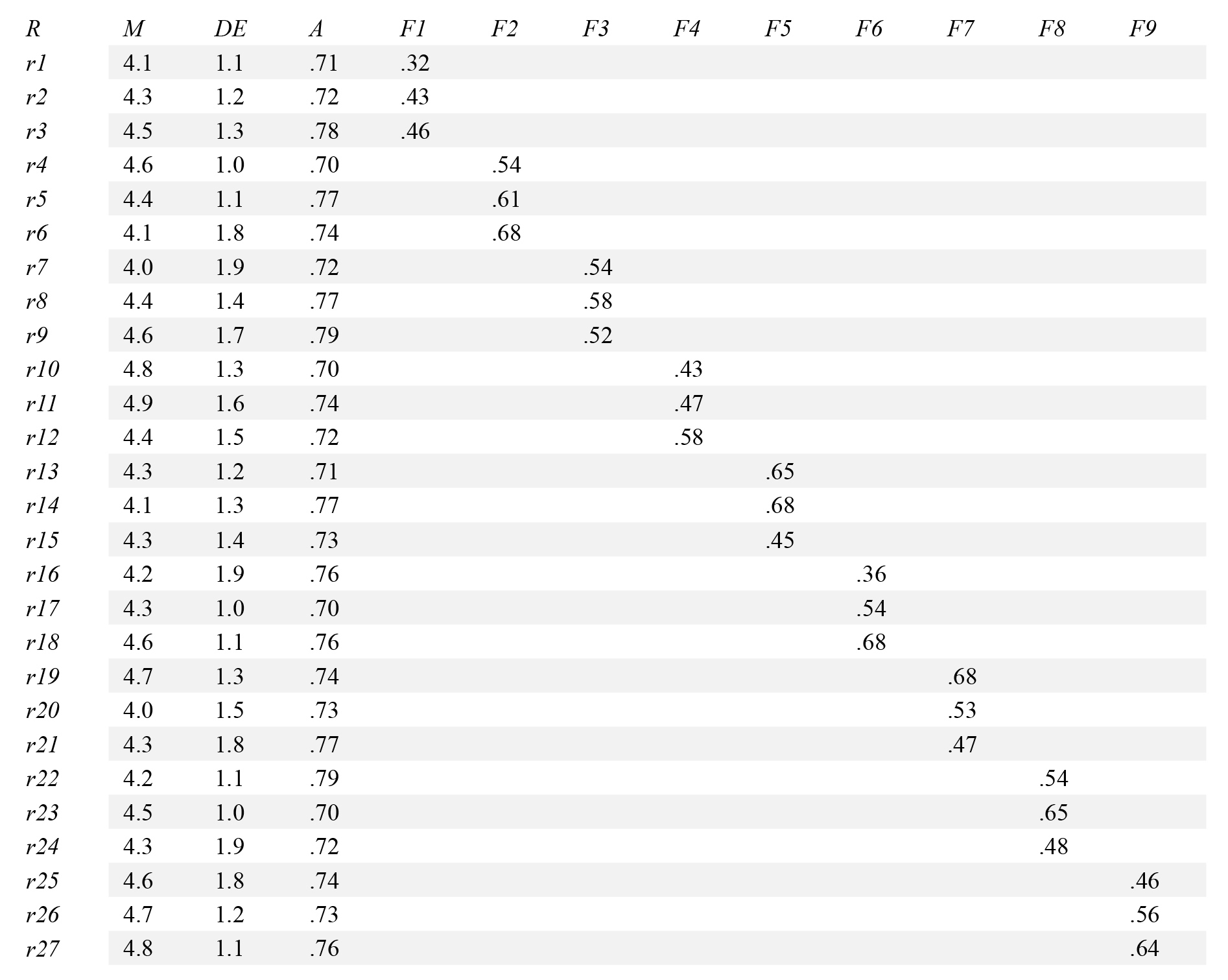 Extracción: Ejes princi-pales, Rotación: Promax. M = Media, DE = Desviación estándar, A = Ítem de valor excluido alfa,