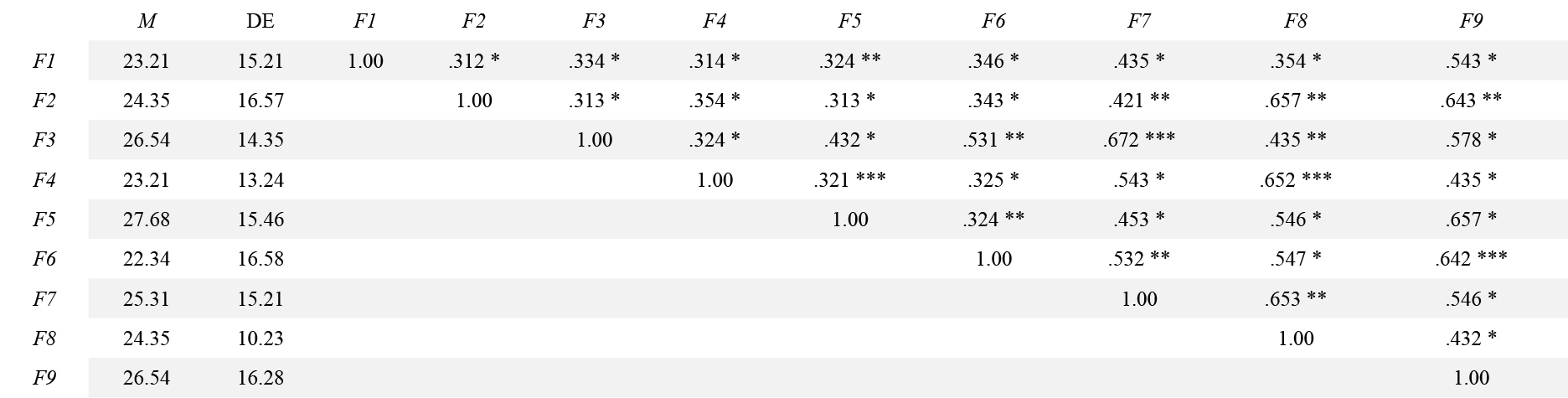 Nota. Elaborado con estudio de datos; M = Media, DE = desviación estándar, F1 = Aesthesis, F2 = Ethos, F3 = Hexis, F4 = Eidos,
