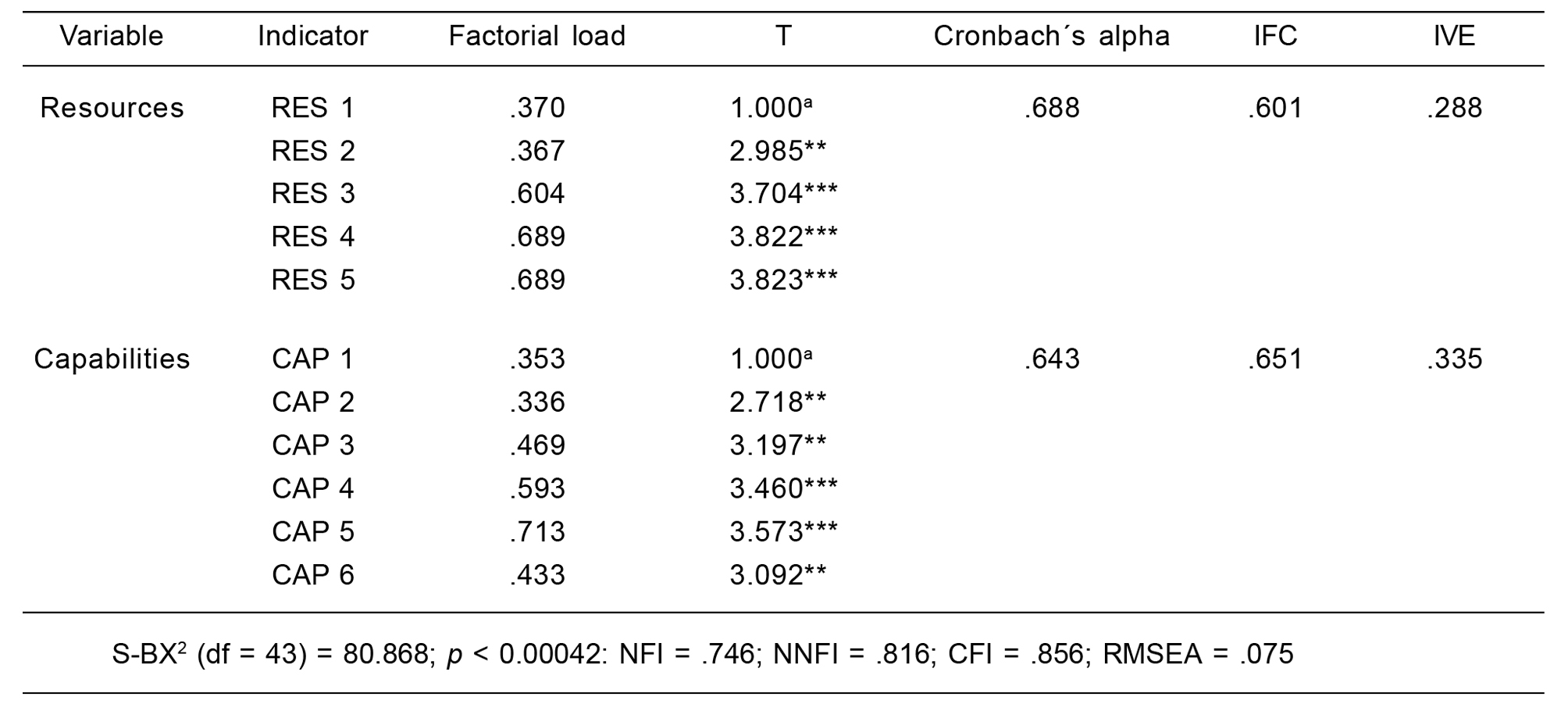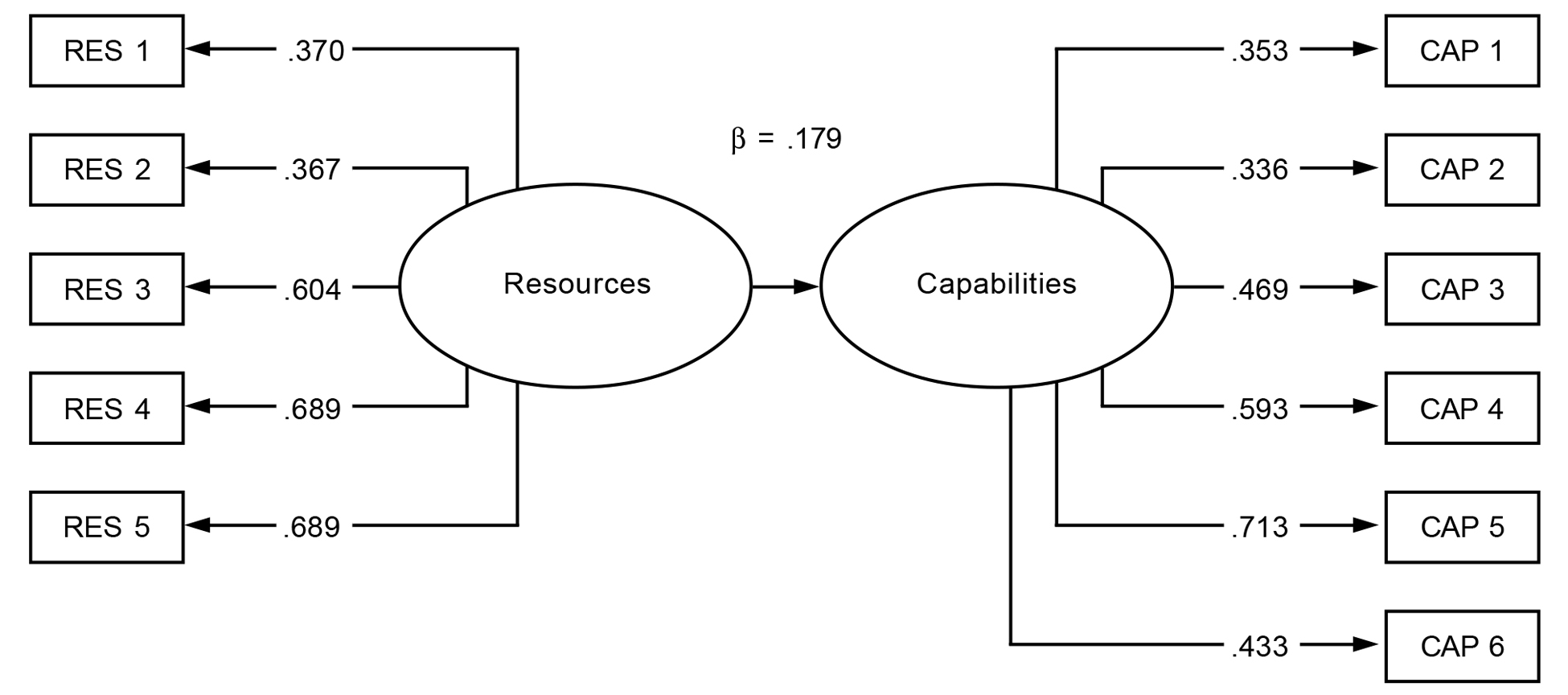 de la literatura, se construyó la variable latente «recursos» medida a través de cinco preguntas y «capacidades» a través de seis ítems. Para la prueba de hipótesis se realizó un análisis de ecuaciones estructurales de máxima