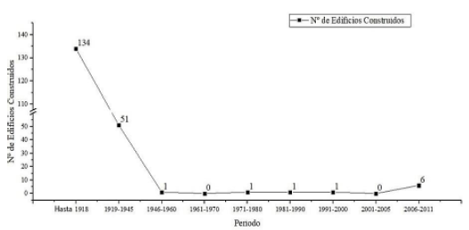 De acuerdo a los datos expresados en la Figura 3, a principios del siglo XX, decrece el número de nuevas construcciones erguidas en Santo Stefano di Sessanio. De hecho, de las 195 edificaciones disponibles en el municipio, según datos del 2011, la mayoría son anteriores a 1918. Es decir, desde el periodo posterior a la Segunda Guerra Mundial hasta el año 2011 fueron levantadas solamente 10 nuevas construcciones en la localidad. La coyuntura de declive demográfico asociada al envejecimiento recurrente de la población, un fenómeno que afecta a distintas localidades en Europa (Crisci y Heins, 2006; Mazzola et al., 2015), son factores claves en la comprensión de las pocas edificaciones erguidas en la comuna a lo largo del siglo XX.