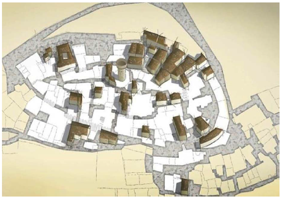 Representación gráfica indicando los edificios adquiridos por el grupo Sextantio en el casco histórico de Santo Stefano di Sessanio