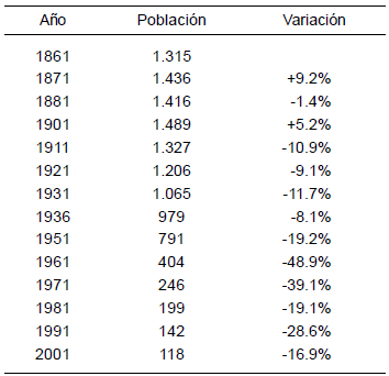 En los datos presentados en la Tabla 1 se observa que a principios del siglo XX hubo un estado acelerado de declive demográfico en el municipio, resultado del abandono territorial que, desde finales del siglo XIX, se ha prolongado. En 2001, con 118 habitantes, el lugar ha perdido más del 90% de su población respecto a 100 años antes, es decir en comparación con los datos de 1901. La ubicación relativamente remota –posicionándose en un parque nacional montañoso– asociada con la condición de marginación frente a las estructuras económicas modernas –que con el avance de la unificación italiana gravitaban principalmente en torno a centros industriales ubicados en el norte del país– fueron hechos que afectaron no solo a Santo Stefano di Sessanio, sino a muchísimas otras localidades incrustadas a lo largo de la cadena de los Apeninos (Marinetti, 2005; Postiglione et al., 2009).