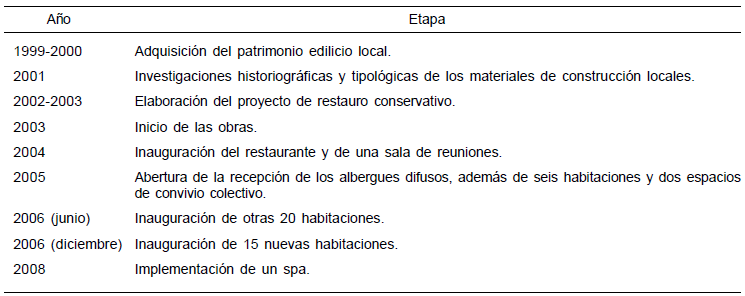 En la Tabla 5 se presenta una síntesis cronológica de las acciones de implementación de los albergues difusos por parte de la Sextantio en la comuna de Santo Stefano di Sessanio.