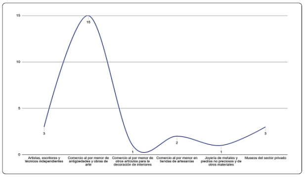 Se puede apreciar en la Tabla 3 y Figura 4 que la mayor concentración de unidades económicas se encuentra en el comercio al por menor de antigüedades y obras de arte, espacios que permiten la contemplación de las obras u objetos.