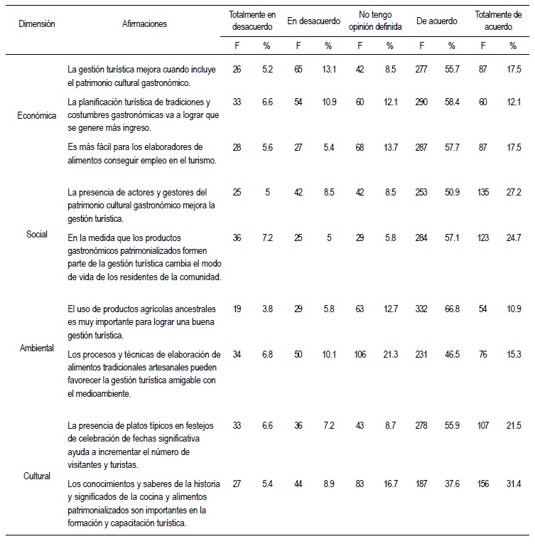 Con relación a la dimensión cultural, el 73.2% de los encuestados considera que es positiva. Un 14% lo hace negativamente y un 12.7% no tiene una opinión definida al respecto. La presencia de platos típicos en festejos de celebración de fechas significativas ayuda a incrementar el número de visitantes y turistas, según el 77.4% de los encuestados. La afirmación de que los conocimientos y saberes de la historia y significados de la cocina y alimentos patrimonializados son importantes en la formación y capacitación turística es considerada positivamente por el 69% de los encuestados (Tabla 2).