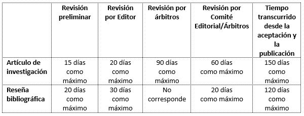 Una vez asignado el artículo de investigación para su evaluación, el proceso de revisión por árbitros tomará como máximo 8 semanas.
